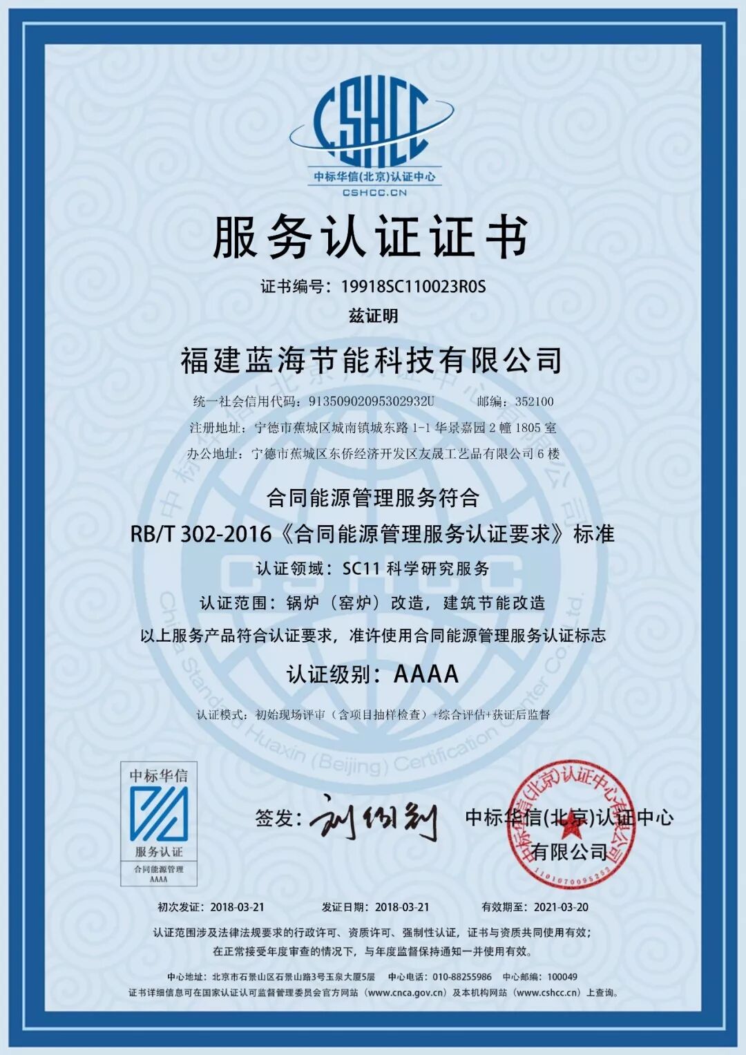 福建藍(lán)海做為以合同能源管理模式投資鍋爐及冷凍站的節(jié)能服務(wù)公司,迅速對該項(xiàng)規(guī)定作出響應(yīng),委托專業(yè)的第三方機(jī)構(gòu)進(jìn)行認(rèn)證工作,并于2018年3月20日獲得鍋爐(窯爐)改造、建筑節(jié)能改造范圍的AAAA級認(rèn)證。